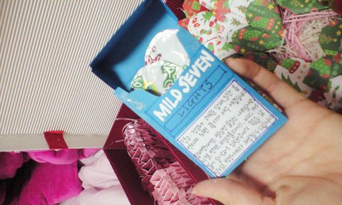 글구 중간에 사뿐히 놓여진.....마일드세븐 모양의 담배곽!!ㅎㅎ 야심차게 준비한..흡연자 울오빠의 건강을 위한 ㅜㅜ귀여운 담배모양의 선물입니당..직접 담배곽을 잘라서 도면을 완성해서 만들었구요안에 담배대신 쏠라씨를 동그랗게