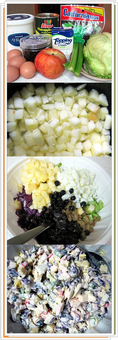 파인애플 블루베리 삶은달걀 건포도 샐러리 캔옥수수 등 과일 종류를 넣었지요.