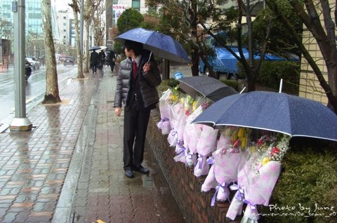 하지만 뭐, 경쟁이 치열할 것 이라는 예상을 안하던 바도 아니니 이내 침착하게 다시 전략을 되짚어 봅니다. 자리는 정문 맞은 편 횡단보도 앞 길가에 잡았습니다. 횡단보도에서 대기하는 사람들을 공략 할 수 있을 것이라는 생각에서였죠. 우리의 전략은 이거였습니다. 꽃의 비주얼로는 경쟁이 안되니, 판매 전략으로 승부를 보자. 우선 둘은 정장에 타이를 매고 나섰습니다. 원래는 인형 옷을 입으려고 하였지만 하루만에 구할 수가 없어서, 정장을 입고 가슴 주머니에 꽃을 꽂고 머리에도 꽃을 꽂는 특이한 복장으로 이목을 끌기 위해서 였습니다. 정장을 입으면 은연중에 장사꾼이 아닌 영업사원 같은 느낌도 약간은 줄 수 있다는 생각도 하였습니다.