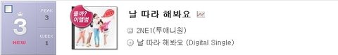 2NE1의 신곡 '날 따라 해봐요'가 발매와 동시에 3위에 올랐네요.