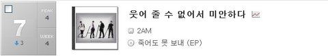 2AM의 '웃어 줄 수 없어 미안하다'는 지난주 보다 3위 하락한 7위에 올랐네요.