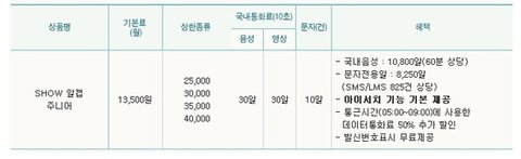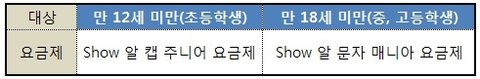 초등학생 :) SHOW 알 캡 주니어 요금제 & 중,고등학생 :) SHOW 알 문자 매니아 요금제가 있어요