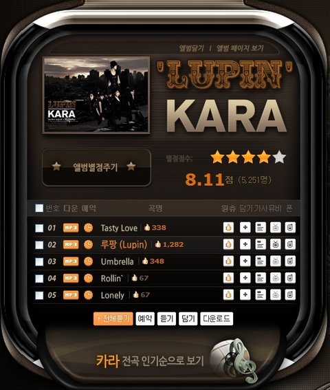 카라가 '루팡'으로 온라인 음원차트를 점령했네요~