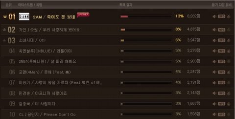 현재 2AM의 죽어도 못보내가 역시..1위를 차지하고 있구요~아이돌 그룹들 사이에서