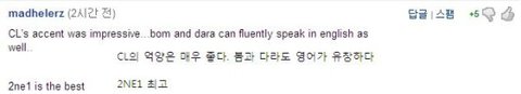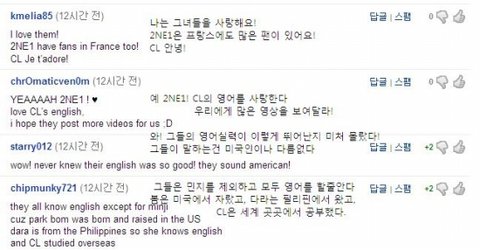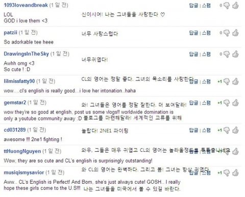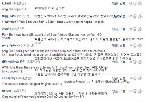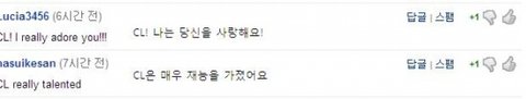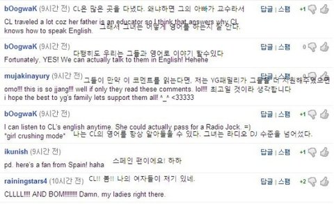 오우 씨엘발음 ㄷㄷ 외국사람들도 칭찬할정도의 영어실력ㅋㅋ대단 그나저나 정말 소문대로 외국인한텐 씨엘이 인기가많구나~ 리플보니 씨엘이랑 봄이가 많은거같네 ㅋ 외국사람들은 얼굴보단 실력을 더중요시보니깐 아무래도 봄이랑 씨엘음색이 외국사람들한텐 더 먹히는듯