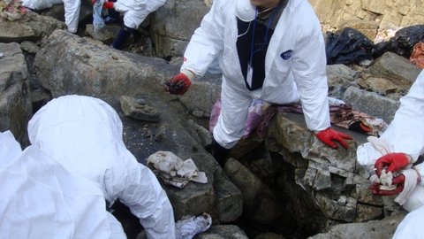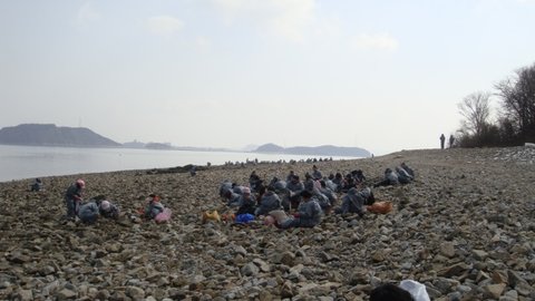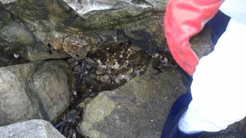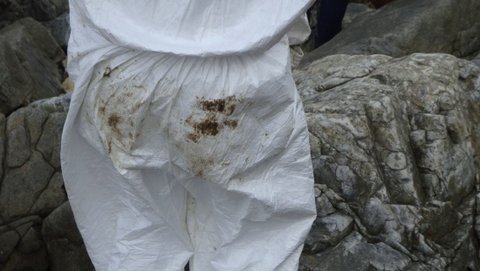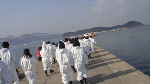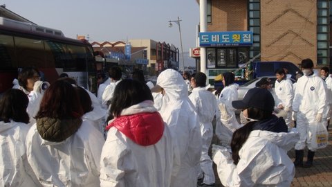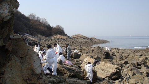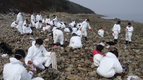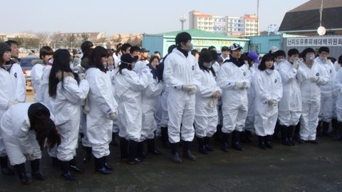 모여서 장화와 작업복은 제공받고 배를 타고 섬으로 기름을 닦으러 들어갔습니다.
