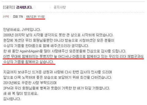■ 반박자료 1 - 2009년 12월 31일, JYPE의 "리더 재범" 언급 ■