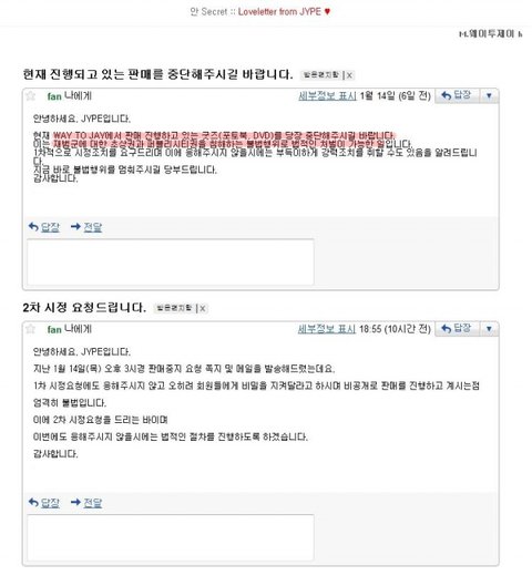 2010년 1월 16일, 재범군의 팬사이트인 "way to jay"에서 진행하는 굿즈에 재범군 "초상권"을 이유로 정지를 요구하는 JYPE.
