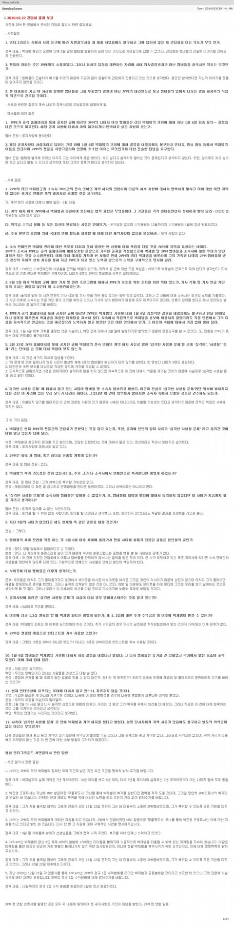 정욱: 이전 간담회에서 왜 멤버 관리 안하냔 질책 받았다. 계약서에 사생활을 제한하지 않는다고 명시되어 있다. 기본적으로 연예인의 사생활은 연예인 본인이 책임져야 한다.