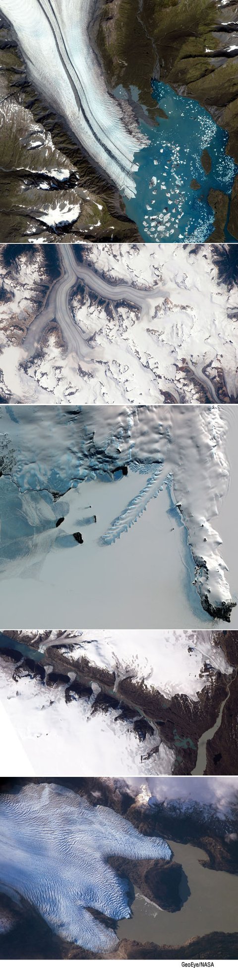세 번째는 그린랜드 남부의 계곡 모습이며, 검은 땅을 뒤덮고 있는 생명체를 연상케하는 맨 아래의 빙하는 칠레 그레이 빙하이다.