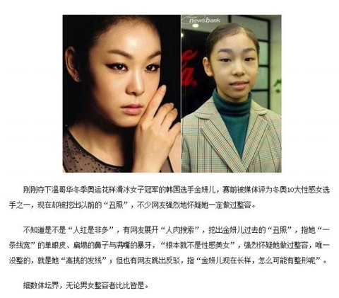 전 중국에서 유학중인 학생인데. 동영상 찾아볼게 있어서 중국유명 포털사이트인 Baidu에 들어갔는데동영상쪽을 클릭하니 메인화면에 김연아이름이 보여서클릭했는데 자세히보니 저런내용이였어요.내용은 대충 벤쿠버올림픽 피겨금메달의 김연아를 대충 소개한뒤 뒤에 문단에서 어린시절의 사진을 추한사진쯤..? 으로 표현하면서 원래 전혀 예쁘지 않았는데 성형수술로 고도로 발전된 얼굴정도로표현해버렸네요 ㅉㅉㅉ흠집내기인지...질투가나서 그러는건지...에휴...한심하긴..