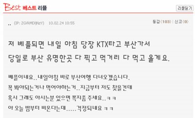 이 톡을 보다가 무심결에 적은 리플이 베플이 되버렸죠..
