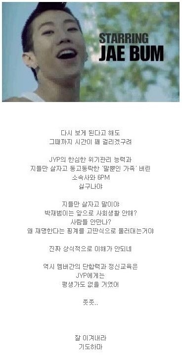 이미지들의 출처는 다음 ㅉㅃ카페와 원데이룸이라고 하네요.. 총칼보다 잔인한 건 사람의 마음이라고 하는 말이 있습니다. 하지만 그런 사람의 마음보다 더 무서운 건 인간의 세 치 혀지요.2pm이라는 그룹의 나머지 멤버들이 자신의 팬들에게마저 지탄받고 외면 받는 것은 그들의 입에서 한 순간에 나왔던 하지만 결코 주워담을 수는 없는 말 때문이리라 봅니다.도대체 박재범이라는 한 사람이 어떤 잘못을 했길래 (제가 봤을 때 잘못을 한 것 같진 않지만) 자신의 어머니의 나라에서 수년 간 흘렸던 땀방울도, 노력도, 시간도, 꿈마저 포기한 채 그렇게 쫓기다시피 뒷모습만 남기고 떠나야만 했을까요.단지 그에게 잘못이 있다면 그가 가진 인간성이, 사람 됨됨이가 누구보다 깨끗하다는 거 밖엔 없는 듯 보이네요.왜 성경에 그런 구절이 있잖아요, “너희 가운데 죄 없는 사람이 먼저 이 여인에게 돌을 던지라.”라는..........이 구절을 누구보다 재범에게 돌을 던지고 손가락질 했던 사람들에게 그리고 그 때문에 자신이 피해자라고 했던 2pm 멤버들에게 먼저 해주고 싶네요.누군가에게 손가락질을 하면 한 손가락은 상대방을 가리키지만, 남은 세 손가락은 자신을 향하는 법인데.......다른 사람을 죽이며 살려 하는 사람은 동시에 자신 또한 죽을 각오를 하며 살아가야 하는 법입니다. 그게 바로 인과응보(因果應報)요, 종두득두(種豆得豆)라는 말이지요.지금은 이 공간이 남은 다섯멤버들에 대한 비난과 그들에 관한 말들로 가득하지만 시간이 흐르고 사람들의 기억 속에서 차츰 잊혀지게 되면,그들은 여타 다른 구설수에 올랐던 다른 연예인들처럼 또다시 텔레비전에 얼굴을 비추고 웃음을 팔고 할지 모르겠습니다.하지만 그들이 어찌되든, 저는 우선 무엇보다도자신보다 동생들을 먼저 생각하고, 그들에게 피해를 주지 않기 위해 수 년이라는 시간도, 노력도 말 없이 포기하고 간,자신을 낮추고 고개숙여 인사하며, 끊임없이 노력을 하는, 팬들이 선물했다는 이유만으로 흰 티위에 검은 티 위에 야구잠바까지 입고 비보잉을 하는,가장 갖고싶은 초능력이 뭐냐고 물었을 때 나중에 결혼했을 때 아내의 마음을 읽고 언제나 행복하게 해줄 것 같다는 이유로 독심술을 갖고 싶다고 얘기한,길거리에서 누군가 그에게 시비를 걸어도, 공인이라는 이유로, 리더라는 이유로 자신의 팀에게 피해를 줄 수 없다며 묵묵히 반응 않고 넘어간,그를 아는 사람이라면 그의 잘생긴 외모보다도, 뛰어난 춤실력보다도, 그의 인간성 때문에, 따뜻함 때문에 그를 좋아하게 만드는, 기억하게 만드는누구보다 웃음이 이쁜 한 사람.박재범씨 당신의 행복을 빕니다.미안합니다. 당신 motherland의 한 국민으로서.......p.s 전 개인적으로 핫티스는 아니었지만 그들의 보이콧운동엔 참여의사를 밝힙니다. (2pm 멤버들보다도 우선 무엇보다 박진영씨가 싫어서요... 악플은 자제합시다.)