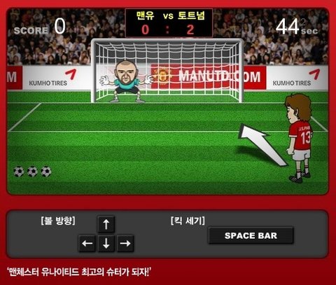 맨유 캐릭터 골라서 패널티킥 차서 성공하기 게임인데요 처음엔 어려웠는데 하다보니 오기가 생기더군요 ㅋㅋㅋㅋㅋㅋ