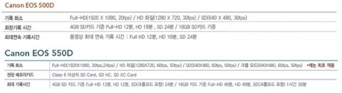 캐논 홈페이지에 들어가 보니, 550D와 500D의 비교표가 전문가리뷰를 통해 잘 정리되어 있었습니다.
