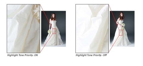 이런 상황에서 하이라이트 우선 기능을 사용하면, 왼쪽과 같이 드레스의 디테일이 살아나게 되는 것이죠~ㅎㅎ