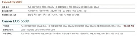 캐논 홈페이지에 들어가 보니, 550D와 500D의 비교표가 전문가리뷰를 통해 잘 정리되어 있었습니다.