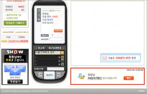 네이트온에서는 SKT인증회원에게는 100건, 네이트온 인증회원 10건의 무료문자를 제공하고 있어요. 저는 SKT를 쓰지않으므로 슬프지만 10건 …. ㅠㅠ 방법은 간단해요,