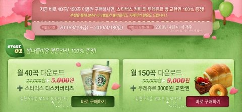 첫번째는 40/150곡 이용권 구매 시 스타벅스와 뚜레주르 빵 교환권을 무료로 준다.