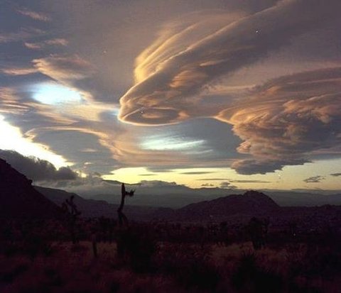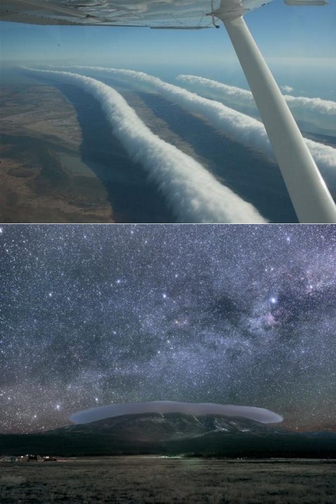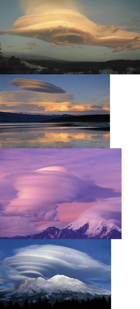 렌즈 모양의 구름이 여러겹 쌓인 모습의 렌즈 구름(Lenticularis)상부의 건조한 공기가 분함유량에 의해서 점점 층을 이루게 되어 생긴다고 하네요.