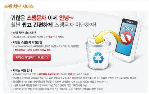 쇼홈페이지에서 문자,통화에서 스팸차단서비스로