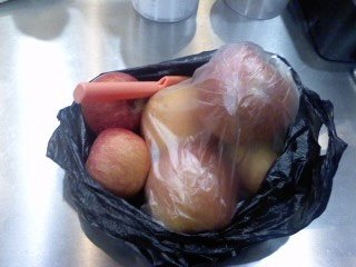 무슨 검은 봉지??를 주시는거에요 . 그러면서 봉지를 열어보니까 빨간 사과7개 정도와 함께 과도가 들어있는거에요.