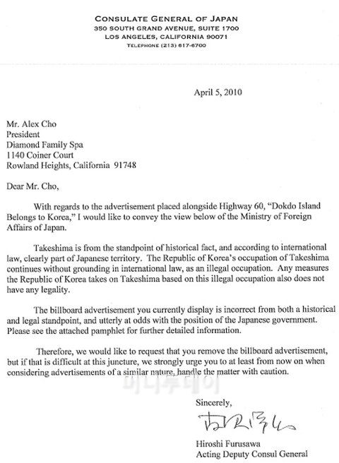 이 광고 덕분에 조 씨는 일본 영사관으로 부터 당장 광고를 철거하라는 내용의 서신이 포함된 서류를 받았고, 일본 총영사관측은 항의 편지와 함께 ‘다케시마에 대한 10가지 현안’이라는 외무성 책자까지 동봉했다. 조 씨는 “편지를 받고 당황스럽고 불쾌했다”며 “한 국가가 개인을 상대로 협박을 한 사실에 두렵고 걱정스럽기도 하지만 너무나 화가 난다”고 말했다. 조 씨는 당초 4월15일까지 였던 광고 기한을 연장하기로 했다.