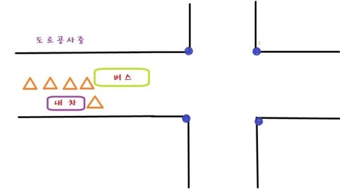마주오던 버스가 공사현장에 라바콘을 밀고가서 본인차에 맞음