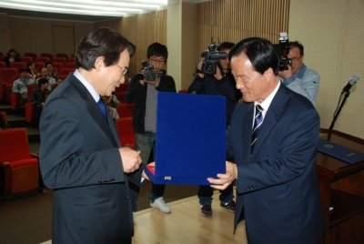 에이스그룹 총수이신 구관영 회장님(오른쪽)과 우리대학 김두회 부총장님(왼쪽)