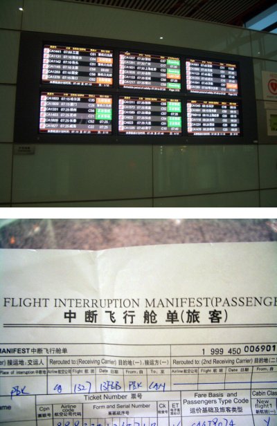 처음엔 별 생각없이 따졌는데 생각해보니 너무 억울한겁니다 ㅡㅡ. 한 5분간 실랑이 하다가,(저쪽에선 했던말만 반복) '안 되겠다. 당신 boss좀 봐야겠다. 데려달라' 라고 하니 그 쪽에서 잠시 기다리라 하더니 한 10분뒤에 티켓을 발권해 주겠다는겁니다. 그래서 '추가비용을 지불해야 하나' 라고 물으니, 그럴 필요없답니다. 와. 정말 하늘이 노래지고, 그때 기쁨은 형용불가 했지만, 아직까지 새 티켓이 제 손에 들어온게 아니기 때문에 끝까지 표정 안풀고 있었는데 여권을 달랍니다. 엄마거랑 제거랑 줬는데, 이 스튜어디스가 여권두장들고 20분간 안나타나는겁니다. 아무리 공항이고, 항공사 직원이지만 중국은 워낙 기상천외한 일들이 많이 일어나는 곳이라 '여권들고 도망갔나...' 라는 생각이 제 머리속을 지배하면서 불안 초조에 휩싸였습니다 ㅋㅋㅋ 제 생애 극단적 기쁨과 극단적 불안함이 10분사이에 이렇게 대립한건 처음이었을겁니다 ㅋㅋㅋㅋㅋㅋ 다행히 좀 있으니 들고 오더라구요. Flight Interruption Manifest 라고 된 종이를 주네요. 이거 받고도 못 미더워서 (중국생활 하면서 늘었던 건 의심밖에 없네요 휴 ㅠ...)