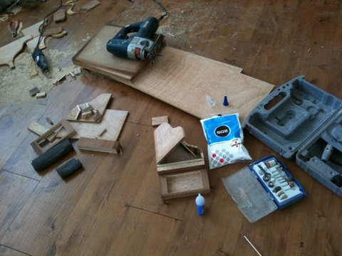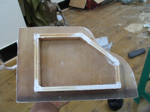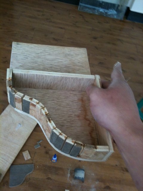 큰 베이스판을 만들고 그 위에 프레임(벽)을 붙입니다. 라운드는 일단 작게 여러개로 나누어 붙였습니다.(합판이 휘진 않으니까요..ㅠㅠ) 나중에 퍼티 바르고 갈아낼 생각으로.. 틈새가 생기는데, 그냥 놔두면 약해지니까(약해지면 안돼..ㅠㅠ) 오공본드에 톱밥을 섞어서 매꿨어요. 완전 짱짱하게..ㅎ