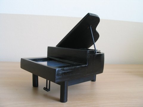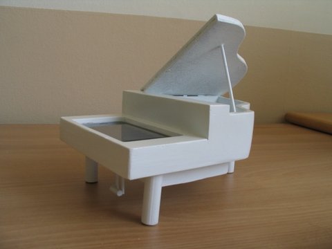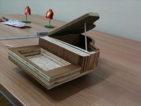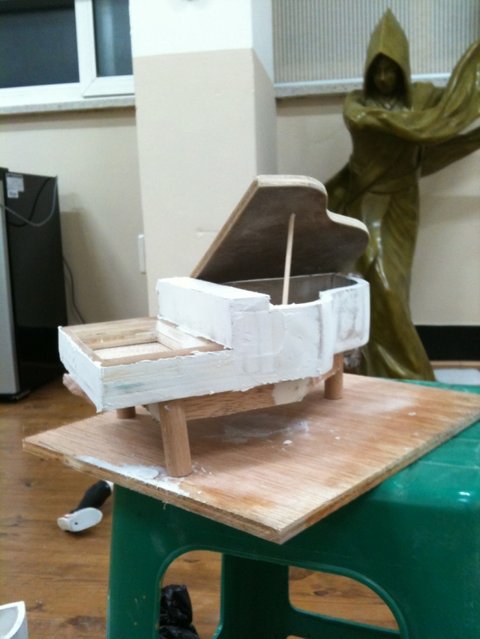 모양이 대충 잡히면 퍼티를 바릅니다. 저는 가지고있는 재료를 쓰느라 핸디코트를 발랐는데.. 페인트 퍼티나 자동차용 퍼티, 폴리코트 등의 수지 제품들이 원래 피아노 느낌을 내는데에는 더 적합하겠죠. 다리와 뚜껑, 버팀봉은 임시 고정한 모습입니다.
