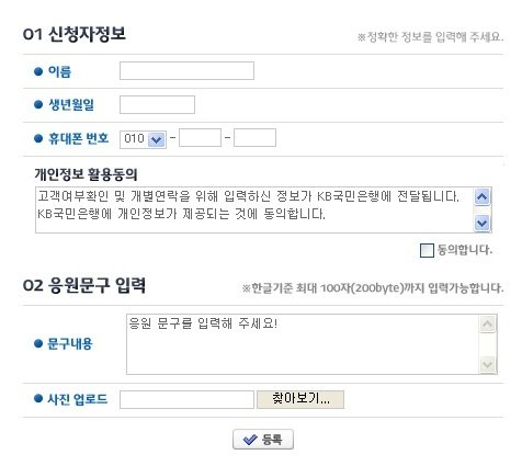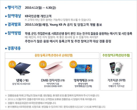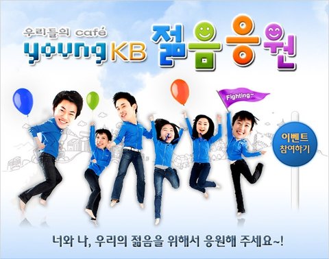 KB국민은행의 따끈따끈한 4월 이벤트 !!! " 젊음응원이벤트"입니다^*^ 자신이나 친구들의 활기 넘치는 젊음을 응원하는 메시지와 함께 사진을 등록해 주세요!추천수에 따라 총 33명에게 넷북, DMB, 전자사전 등의 경품을 드려요! 또한응원 문구를 추천만하셔도 추천인 중 50명을 선정해서 스타벅스 기프티콘을 드린답니다!! 젊음도 응원하고 상품도 많이 받아가세요^^이벤트 참여하시려면 지금바로 YOUNG KB(http://money.kbstar.com/quics?asfilecode=5023&_nextPage=page=YoungKB&weblog=l_footer_C2)로 접속하세요^^!! 그리고 kb캠퍼스스타의 소식이 궁금하시다면 ^^! kbcampusstar 4기 부산경남팀 별을쏘다 블로그 http://blog.naver.com/shootingkb