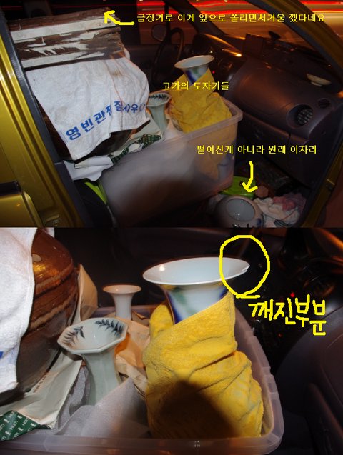 조수석에는 플라스틱 상자 안에 수건으로 대충 둘둘 싸놓은 도자기 몇 병과 요강;