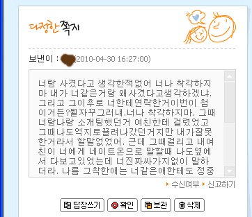 다신너볼생각도 없고 연락할생각도 없어. 일촌끊은것도 나고 네이트에서 먼저삭제한것도 나였어. 근데싸이정리하다보니 니가사진첩에 남긴글들이있더라. 그래서정리하는김에싹을잘라버리려고보낸거다.영원히 안녕