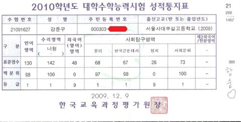 <2010학년도 대학수학능력시험 성적표>