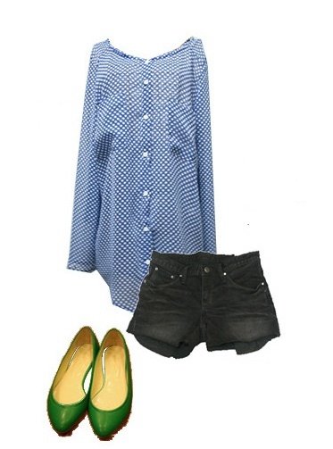 4. 시원한 블루도트블라우스에 초록색 뾰족코 플랫쥬즈라면