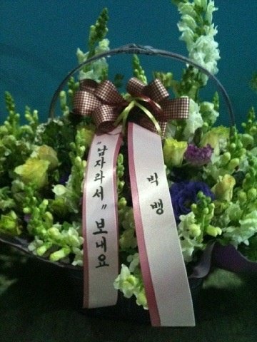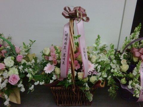 "유후~! 드뎌 거미언니첫방! 짝짝짝! 너무멋있었어요!ㅠ 역시거미언니!!! 저희도 응원가고싶었지만! 지금 어디와있는 관계로 대신 꽃바구니를 전달해드렸어용! 저희 여기서도 열심히 응원했다며^^ㅋ 남자라서 보내고싶었지만 저흰 여자라도 보내요~꽃바구니~ㅋ 거미언니화이삼!^.^ "