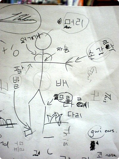 같이 낙서하며 놀던 종이에 졸라맨을 하나 그림. 그리고 호칭을 하나씩 한국말로 적어가기 시작. 하지만 존에게 한국말이란건 아직까진 참 어려운 것임. 그래도 나름 잘 고쳐가면서 받아 적은 듯 ㅋㅋㅋㅋ