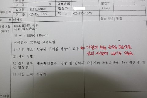 이 문제의 양복만이 아닌 2008년에 같은 매장의 엘르옴므 에서 구입한 다른 양복도 위 사진과 같이 가랑이 부분이 헤져서 A/S(교환)를 받은 일이 있기에 순간 화가 치밀었지만 다시 한 번 A/S를 받아보기로 마음을 가다듬고 문제의 양복을 구입한 매장으로 찾아가 A/S를 부탁하였습니다. 그러나 1달이 다 지나도록 연락이 없어 A/S를 부탁한 매장에 전화해보니 본사로 직접 전화하라하여 본사로 직접 전화하니 심의중이다 담당자가 출장 중이다 라 는 이유로 알아보겠다는 말만하며 회피 하더니 전화 주기로 한 약속일이 2일이 지나서도 연락이 없어 7번째 전화를 하여 담당자와의 통화가 연결되어 문제의 이야기를 하니 문제의 양복은 소비자 책임이며 연락을 늦게 한 것이 미안하여 문제의 양복과 같은 것이 없으니 비슷한 색깔의 2치수 큰 것이 있으니 허리를 줄여서 입으라는 것입니다. 그렇게 할 수 없으면 담당자 본인은 소비자에게 해줄게 없다며 아래의 공분을 보냈습니다.