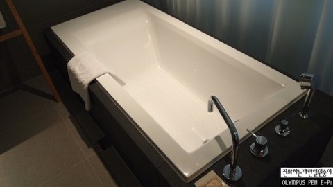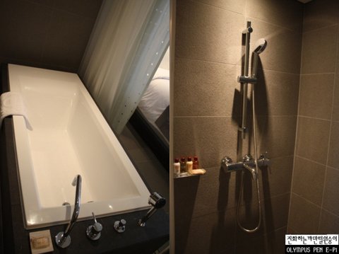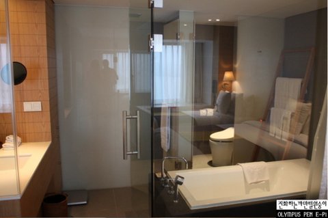 룸의 욕실 역시 오픈형으로 통유리벽을 가진 구조로 되어있습니다.