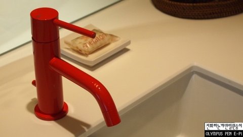 흰색 세면대에 붉은색 수도꼭지는 욕실의 포인트로 충분하다고 생각합니다 !!ㅋㅋ