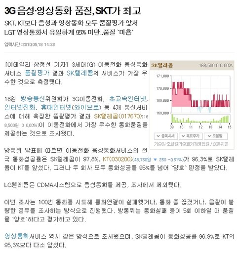 방송통신위원회가 조사한 이동전화 음성통화 품질과 영상통화 품질에서는 1위했네요