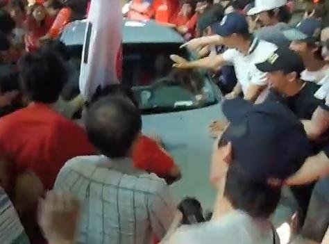 차도위에서 거리응원하는 사람들 30명정도가 저희 차를 완전히 둘러싸고