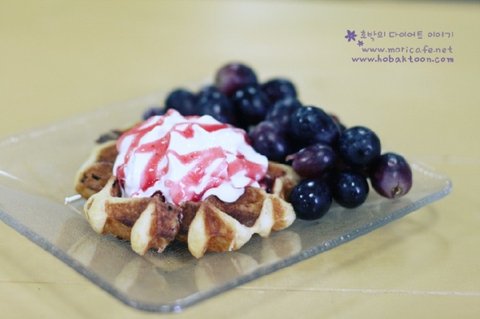 ③ 와플1조각 + 델몬트포도 20알 + 따뜻한 생수1잔 - 시럽뿌리면 아니됩니닷! 아이스크림 더 안돼욧! (사진은 사진일뿐이라며...)
