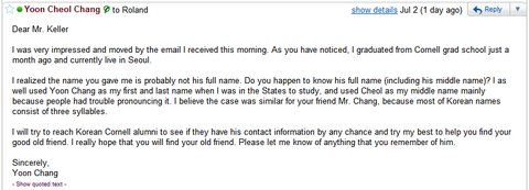 일단 어제 글을 쓰고나서 코넬 대학교 한인동문회에 연락을 취했습니다. 현재 답장을 기다리고있는 중이에요. 좋은 소식이 날아왔으면 참 좋겠습니다. 그리고 Roland 할아버지껜 혹시 친구분의 full name을 아시냐는 이메일을 하나 보냈죠. 제가 썼던 답장 첨부합니다.