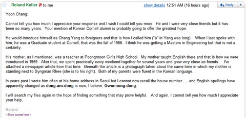 당신의 답장이 얼마나 고마운지 이루 말로 표현할 수가 없습니다. 그와 저는 매우 친한 친구였지만 너무 많은 시간이 흘렀습니다. 코넬 한인 동문회에서 소식을 기다리는 것에 가장큰 기대를 걸고있습니다.
