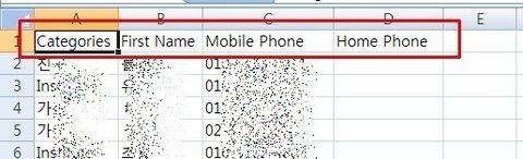 단, 구글은 미쿡서비스이다보니 한국어로 된 항목은 읽지를 못해서, 전화번호로 인식하지 못하고 메모로 인식해 버리기 때문에 엑셀파일에서 Categories, First Name, Mobile Phone, Home Phone... 으로 항목 이름을 바꿔서 저장해야 합니다.