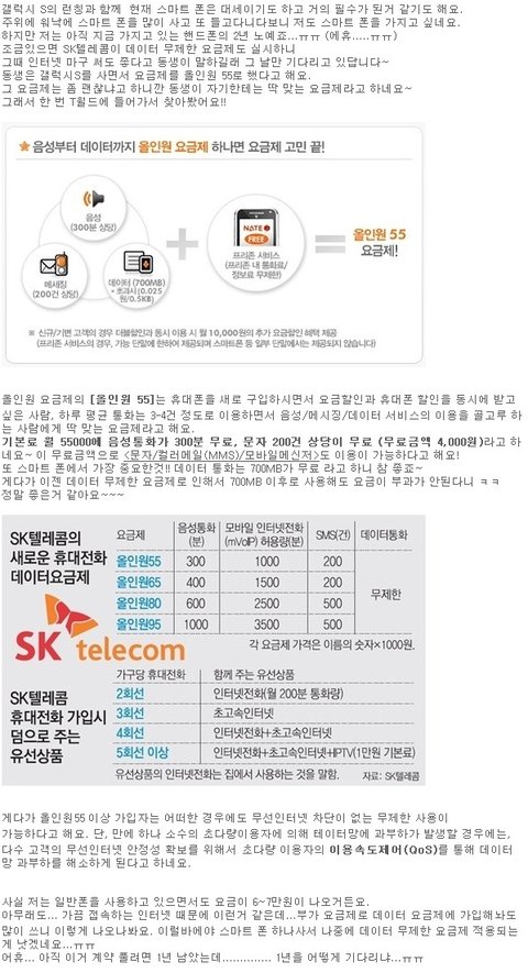 SK텔레콤의 스마트폰을 쓰는 사람이라면 올인원55(올인원 요금제) 어떠세