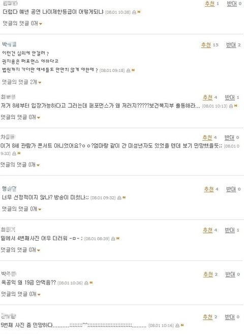 네이트 댓글들을 캡쳐해 놓은 사진이 있건만 기사는 온데간데 없으며,보건복지가족부에서도 이야길하지않는다. 지드래곤 12세이상관람콘,한때 이슈였던 이효리 7세이상관람콘,그리고 이번 2pm..8세이상관람콘.